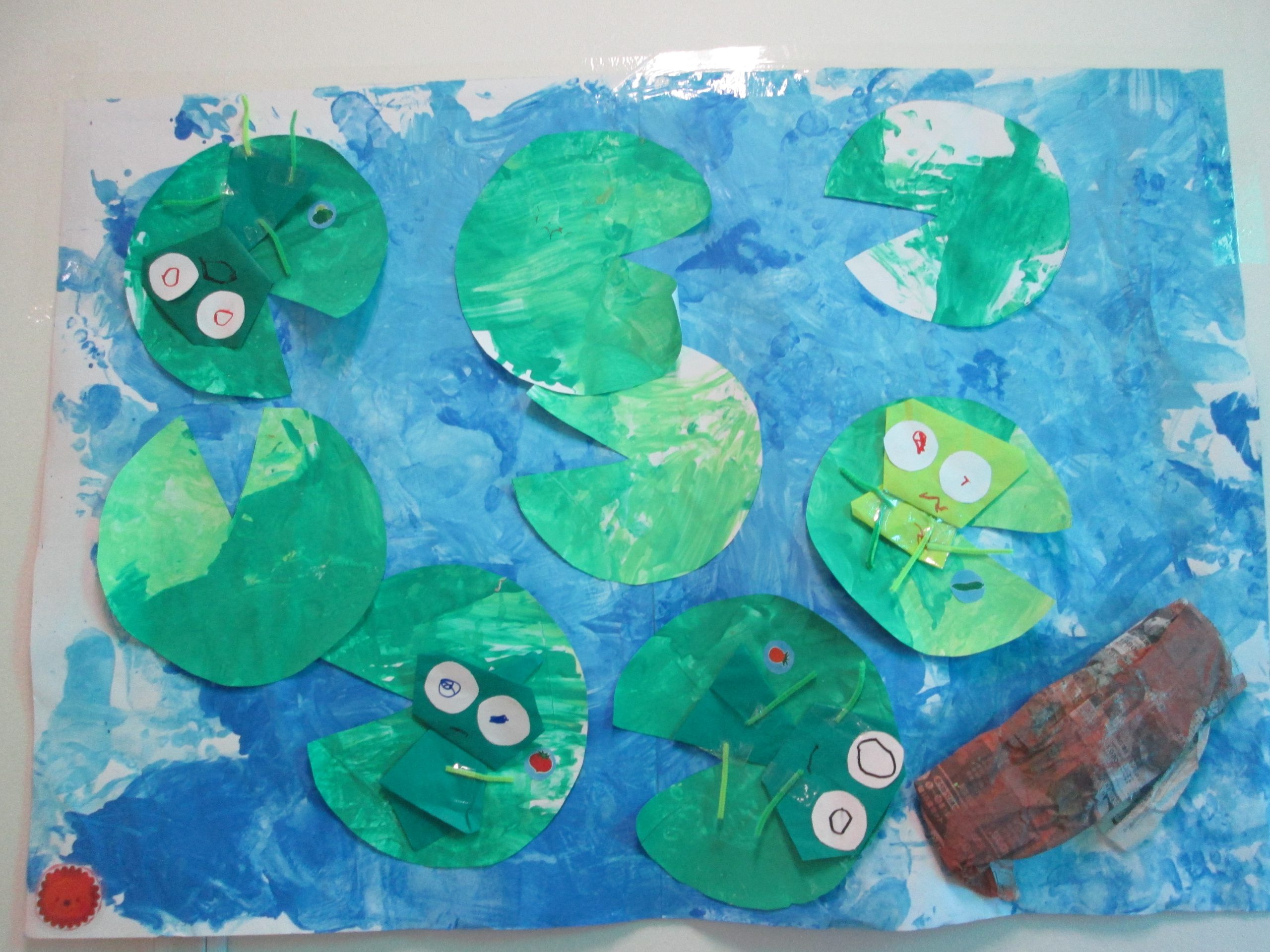 紙や新聞紙を絵の具で塗り木や葉っぱにし、折り紙で作ったかえる、木、葉っぱを好きなところへ貼り