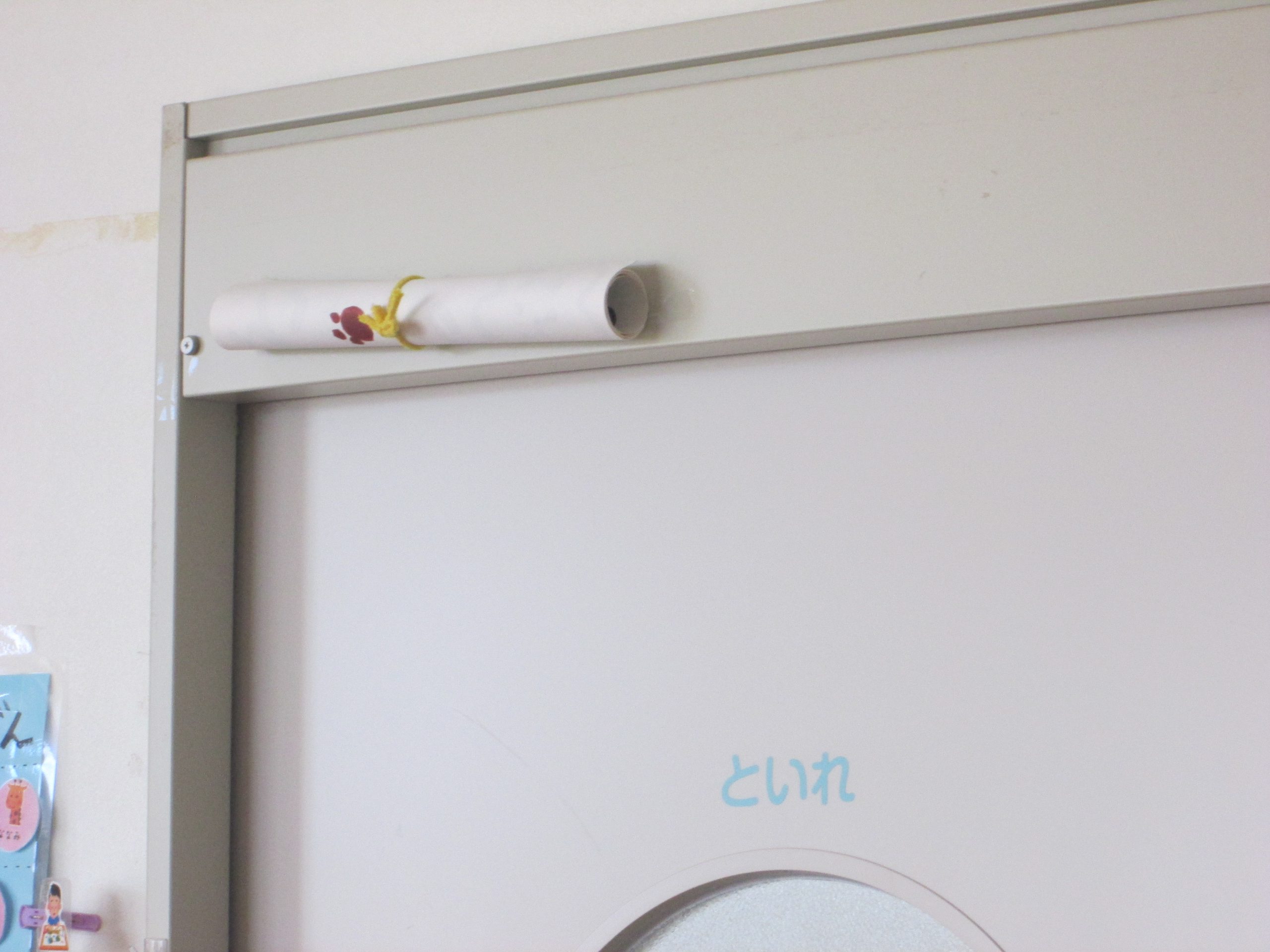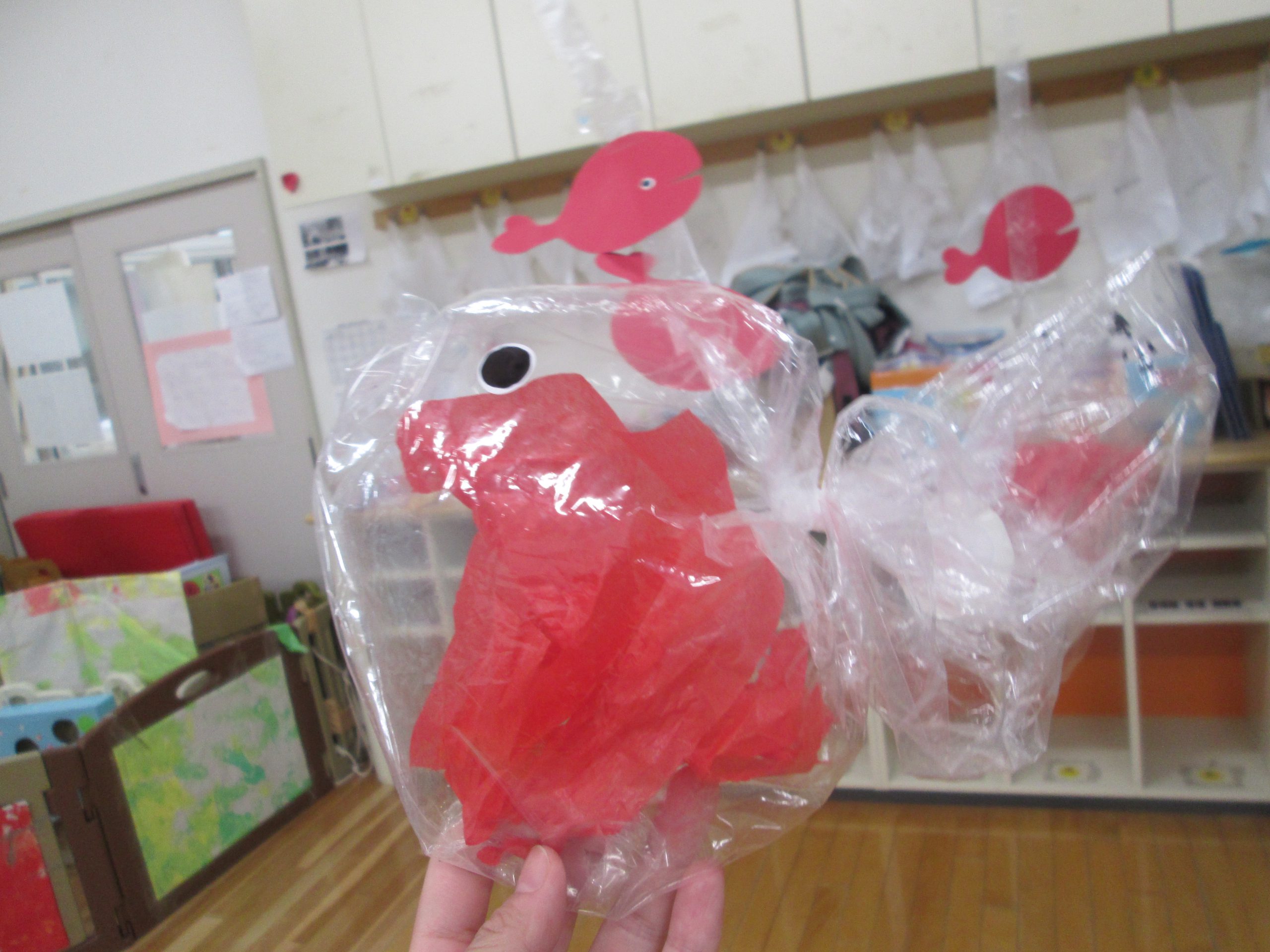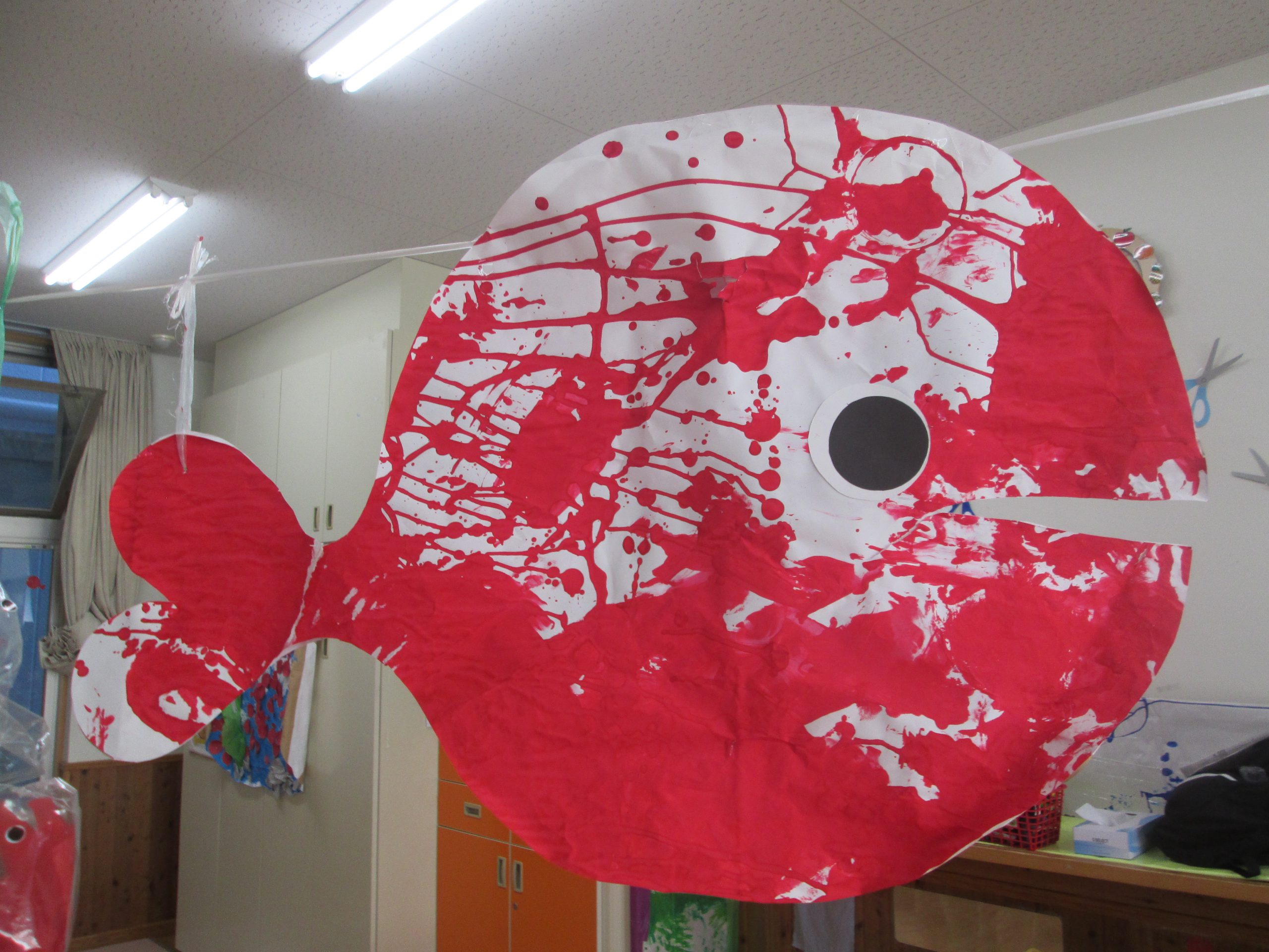 この前にした絵の具遊びの紙を使って、大きなきんぎょを作りお部屋に飾りました~(*´ω`)