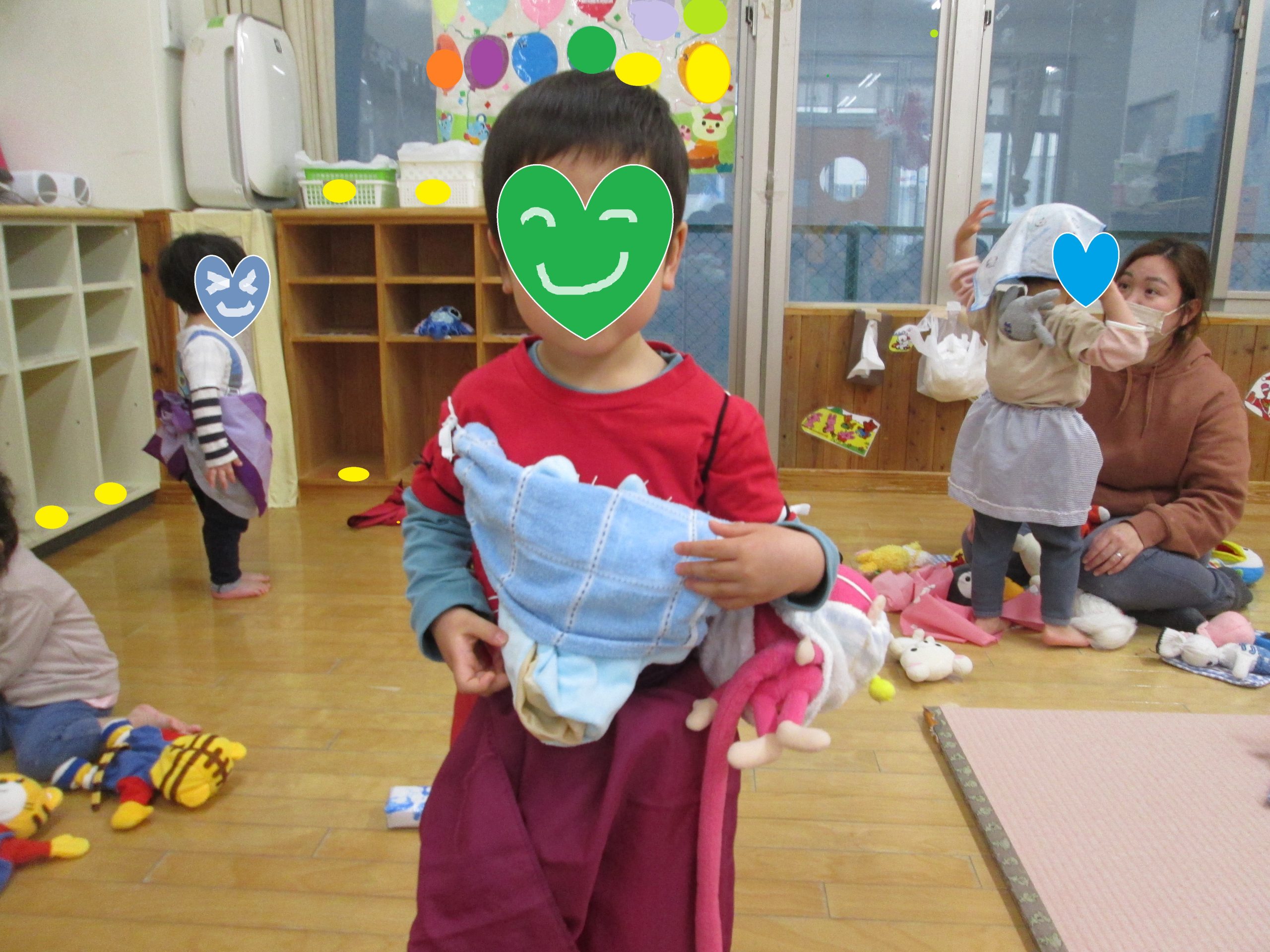 布を頭に巻いて「先生と同じ」と嬉しそうにしたり(給食の配膳の時の姿を言っています♪)、ママやパパになったりしています(^-^)