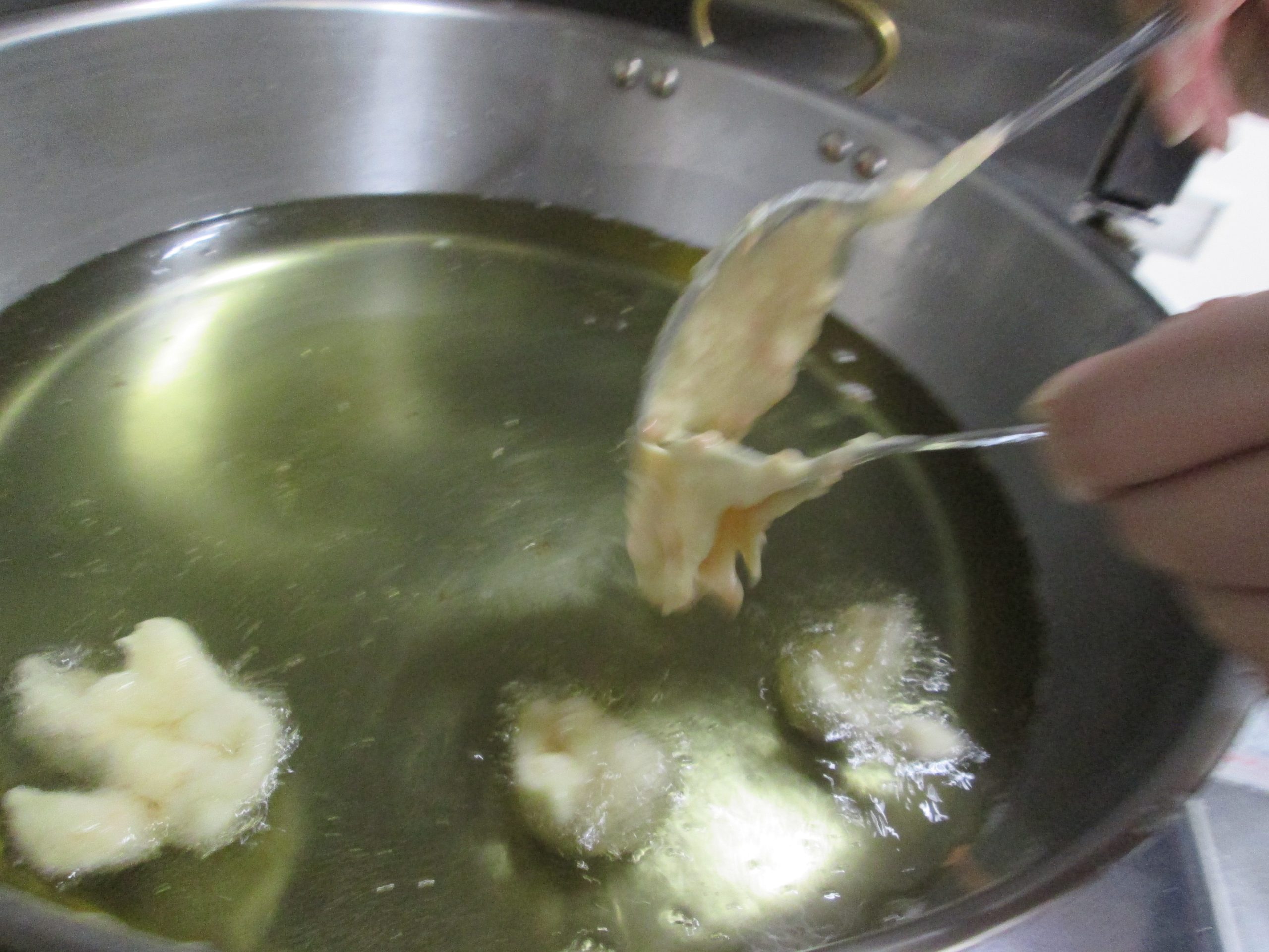 ③温めた油(160℃くらい)に②の生地をティースプーン1杯すくいおとし入れます。