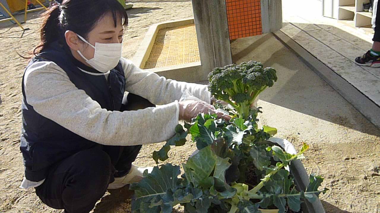 うさぎぐみ(2歳児クラス)のブロッコリーの収穫、クッキングの様子を