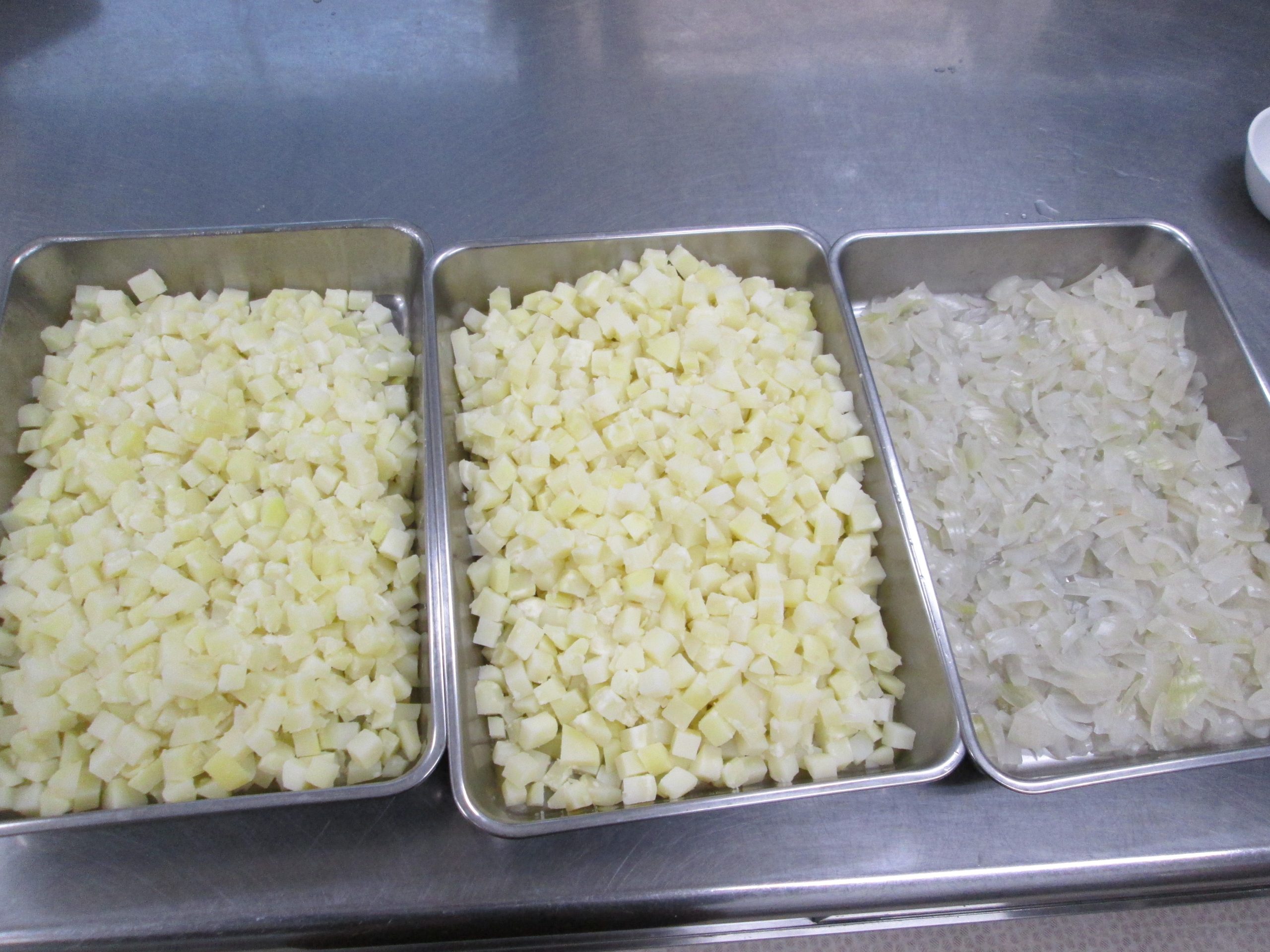 ①じゃがいもは皮むき1㎝の角切りに切り、柔らかくなるまでゆがく