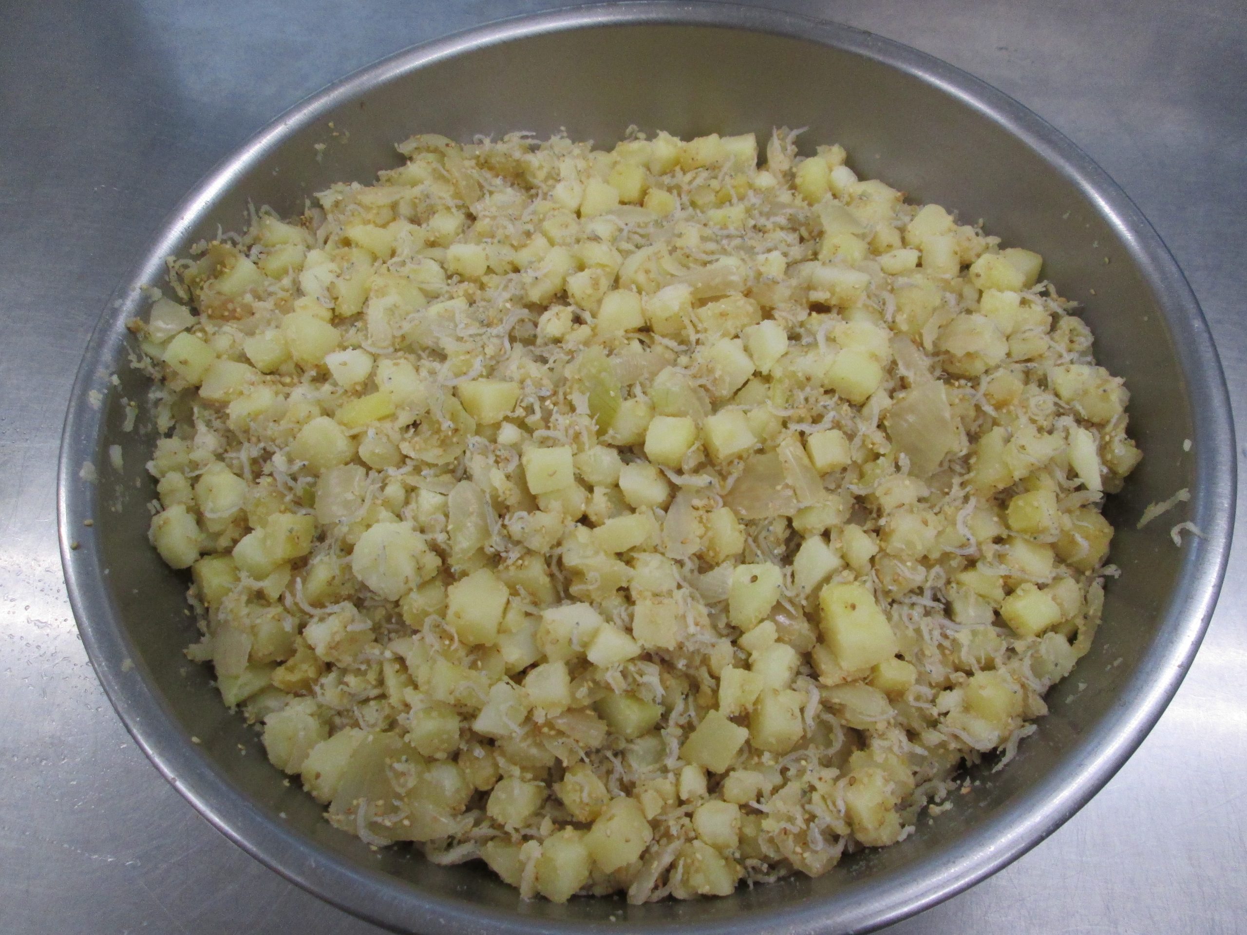 ②ボウルに茹でたじゃがいも、玉ねぎ、ちりめんじゃこ、調味料を入れて