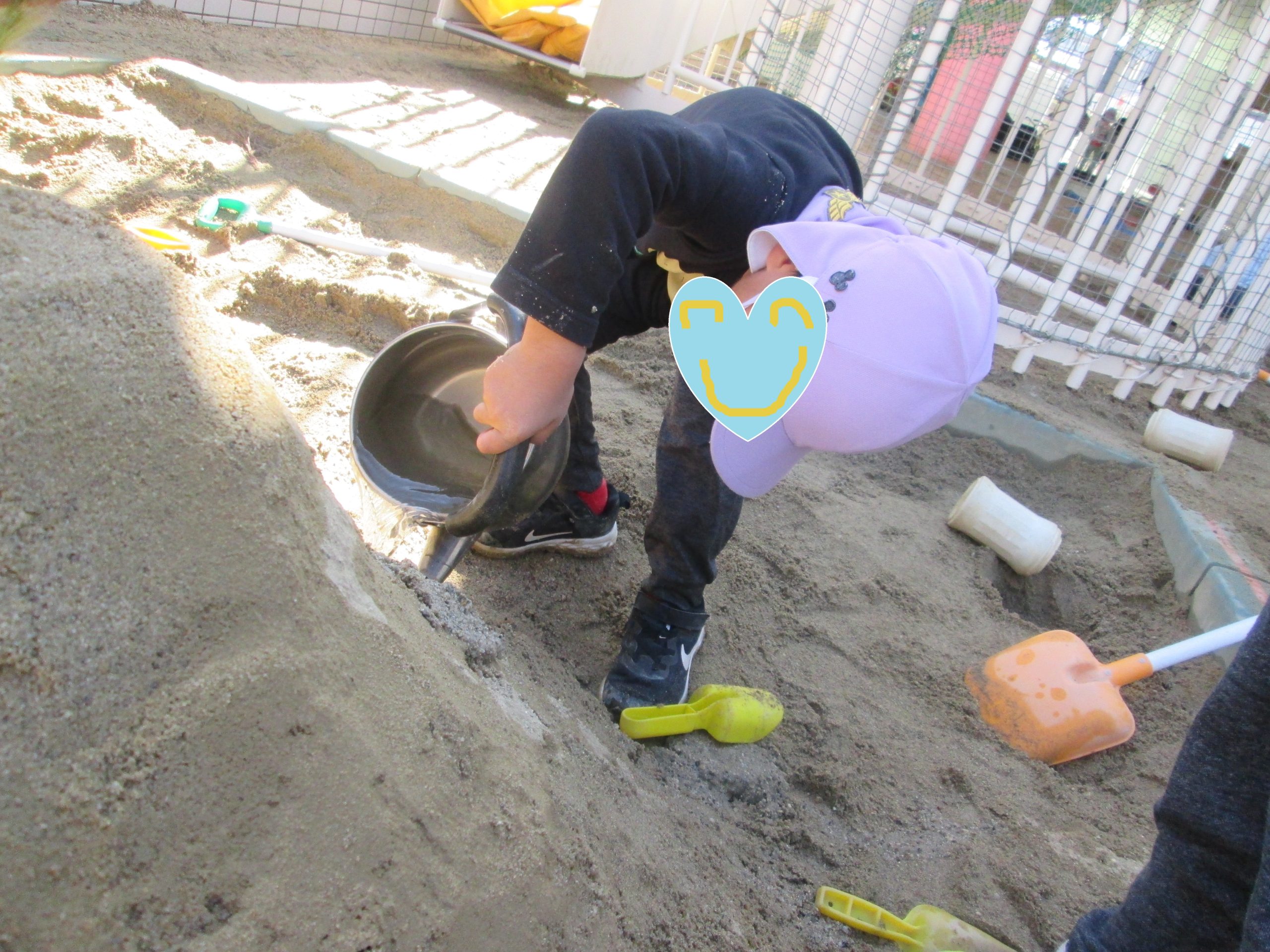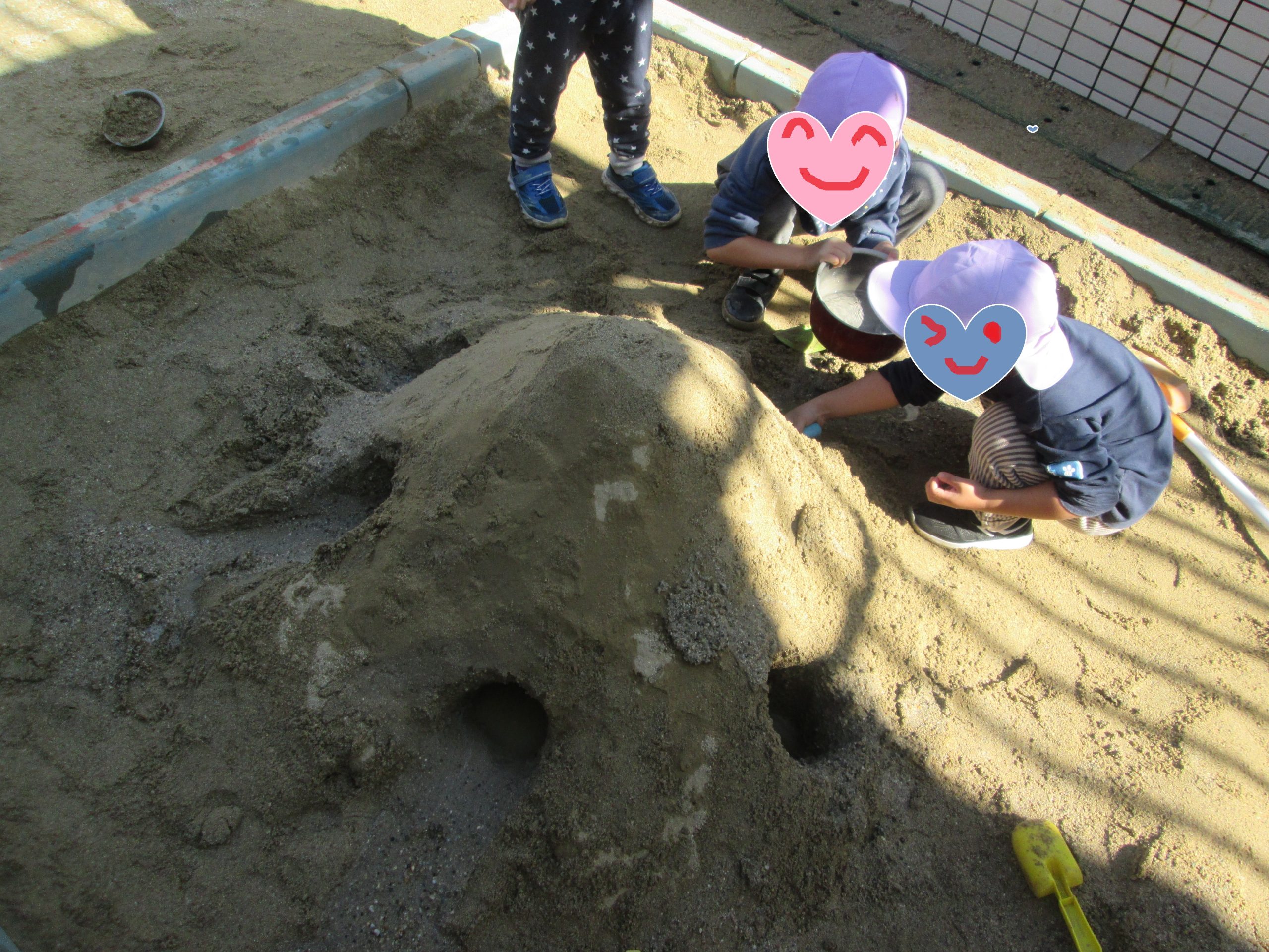 この間、何人かのお友達と砂場でお山を作っていました(^-^)