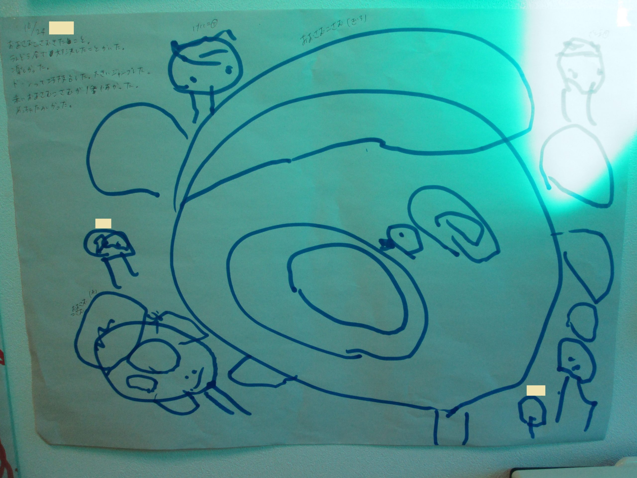 運動会で対決したこと描いた。楽しかった。どー-んって巧技台した。大きいジャンプした。