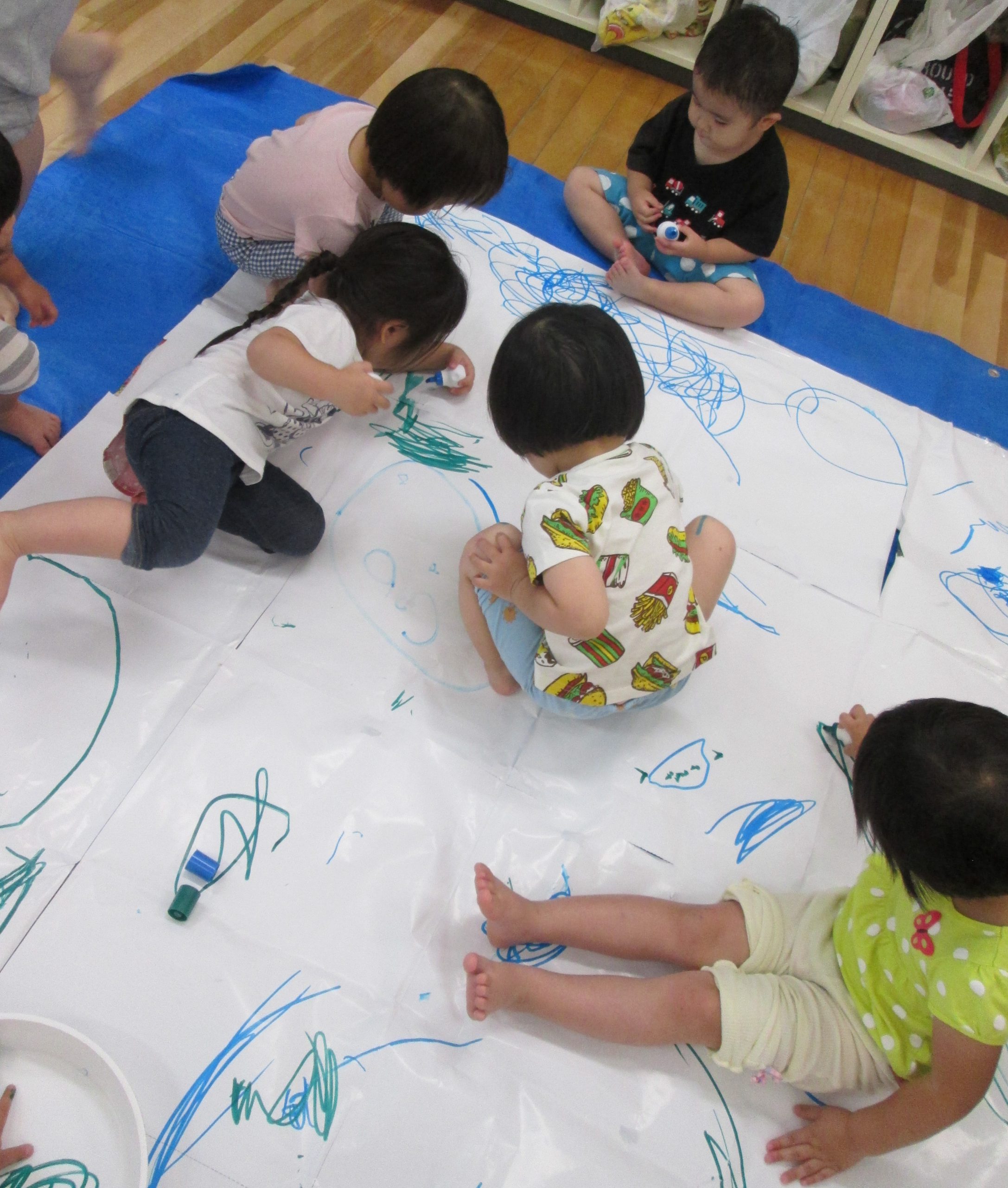 うさぎぐみはお部屋で、大きな紙を用意しみんなでじーじー(描画)を楽しんでいました(^-^)!