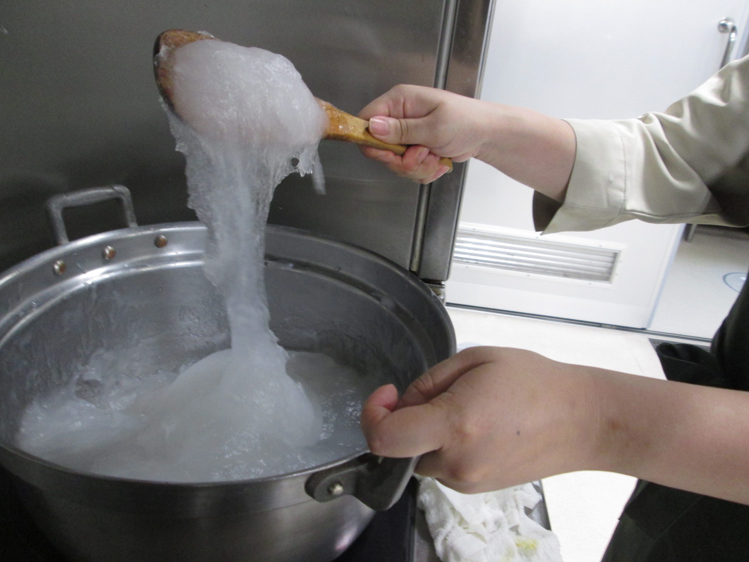 混ぜていくとどんどん粘り気が出てきます。まるでおもちみたいですね~(*^^*)