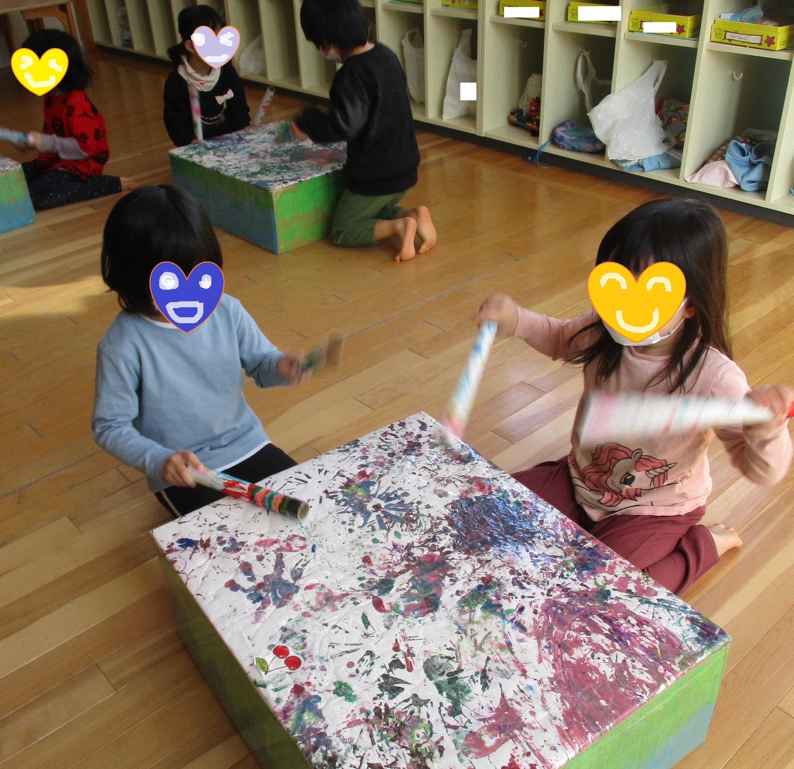 今年度は、園庭遊びだけではなく、感触あそびや絵の具など