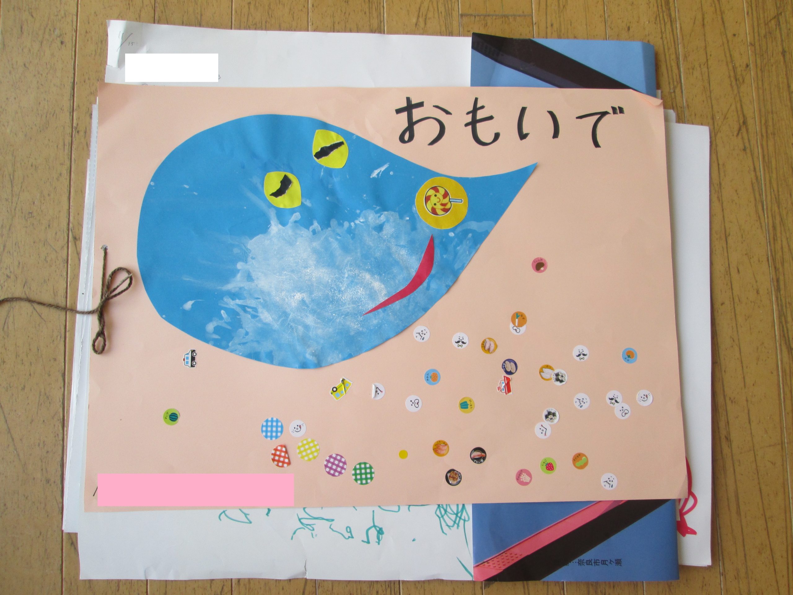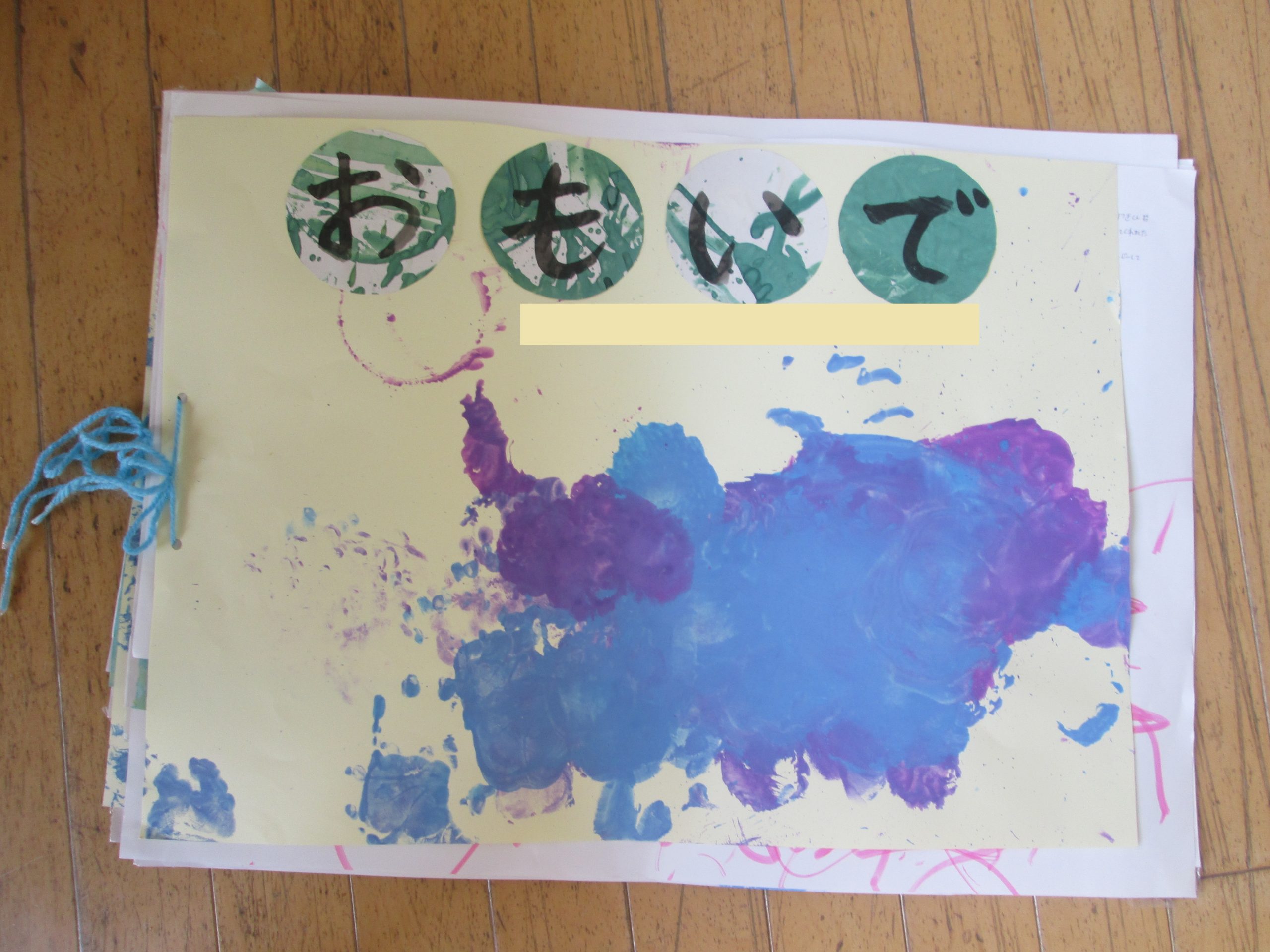 タンポで遊んだものを表紙に、思い出の文字も今まで遊んだ絵の具の紙などを使っています☆